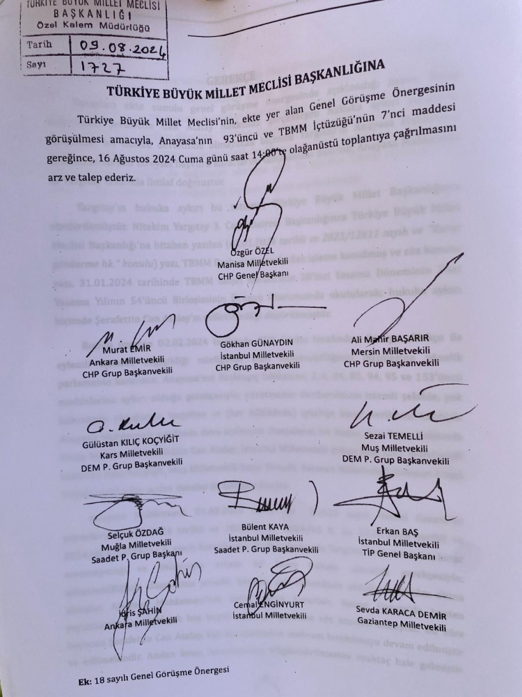Dilekçede CHP lideri Özgür Özel, CHP Grup Başkan Vekilleri, Murat Emir, Gökhan Günaydın, Ali Mahir Başarır, DEM Parti Grup Başkanvekilleri Gülistan Kılıç Koçyiğit ve Sezai Temelli, Saadet Partisi Grup Başkan Vekilleri Selçuk Özdağ ve Bülent Kaya, TİP Genel Başkanı Erkan Baş, DEVA Partisi Milletvekili İdris Şahin, Demokrat Parti Milletvekili Cemal Enginyurt ve Emek Partisi Milletvekili Sevda Karaca'nın imzaları yer aldı.