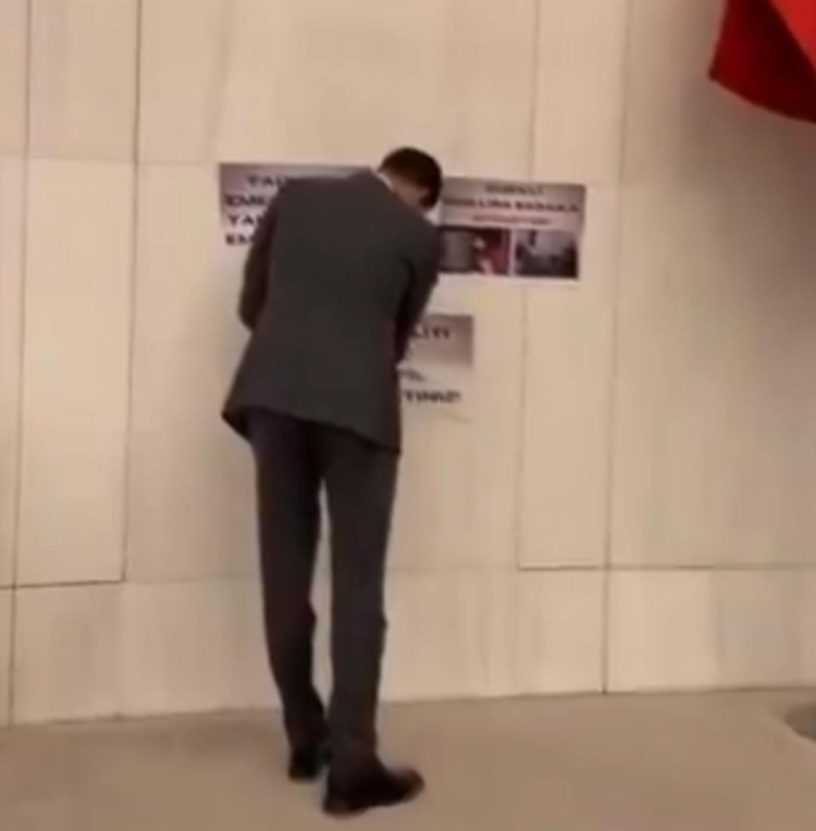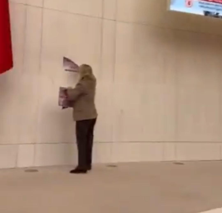 AK Parti Milletvekili Ceyda Bölünmez Çankırı da duvara asılan dövizleri sökerek Başkanlık Divanı’nın arka tarafına götürdü.