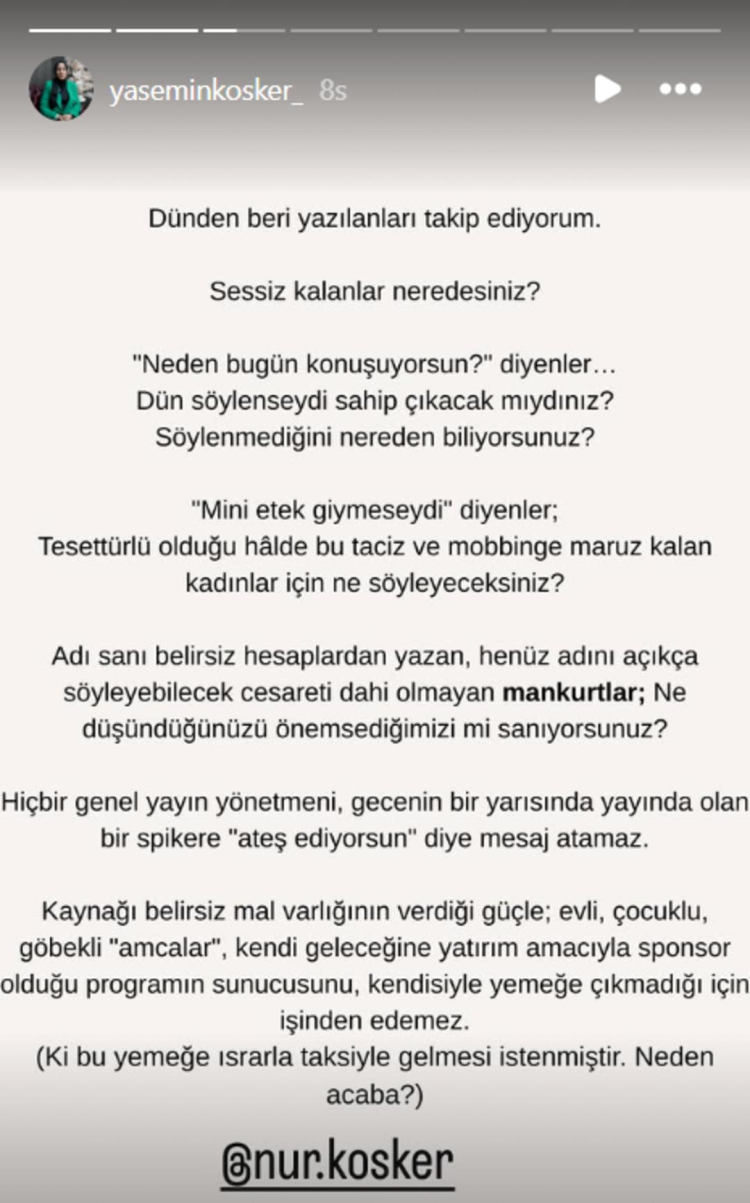 İddiayı dile getiren Nur Köşker'in ablası Yasemin Köşker de yaşananlara ilişkin açıklama yaptı. Sosyal medyadan yaptığı açıklamada abla Köşker "Bilmenizi isterim ki yaşananların, Nur Köşker'e atılan mesajların ve uygulanan mobbingin birebir şahidiyim" dedi.