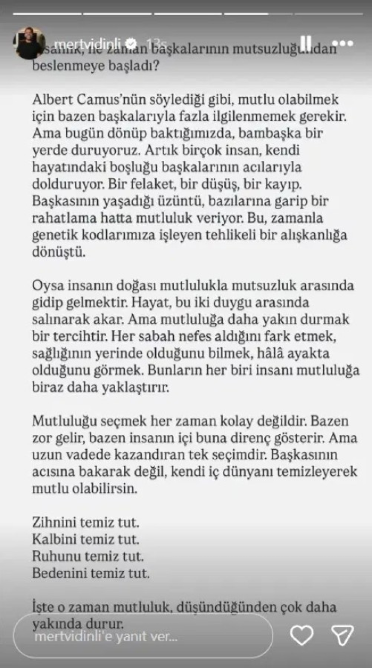 Uyuşturucu soruşturması kapsamında hakkında yakalama kararı çıkarılan fenomen Mert Vidinli, sosyal medya hesabından bir paylaşım yaptı. Vidinli "Mutluluğu seçmek her zaman kolay değildir. Bazen zor gelir, bazen insanın içi buna direnç gösterir" dedi.