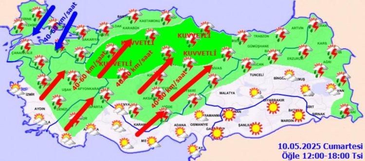 Rüzgarın; Marmara’da kuzey yönlerden, İç kesimlerinde güney ve güneybatı yönlerden kuvvetli (40-60 km/saat), iç Anadolu, İç Ege, Batı Akdeniz'in iç kesimleri ile Orta Karadeniz'in iç kesimlerinde yer yer kısa süreli fırtına şeklinde esmesi beklendiğinden yaşanabilecek olumsuzluklara karşı dikkatli ve tedbirli olunmalıdır.