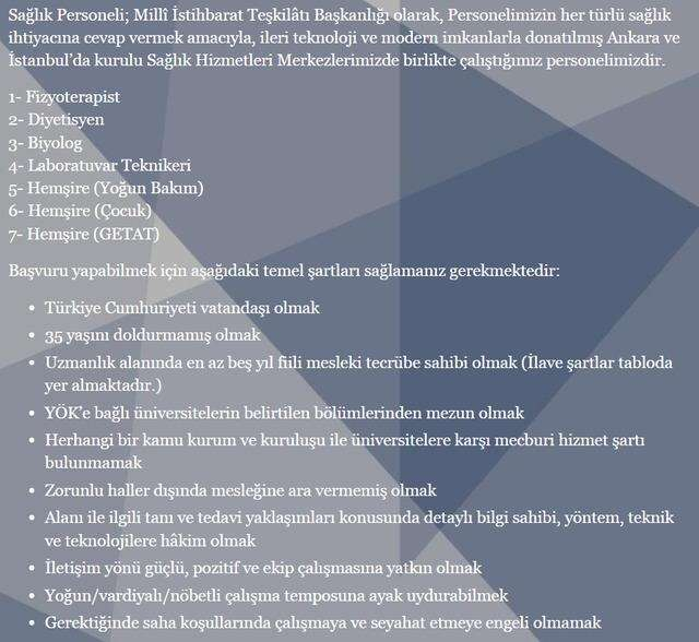 MİT'e kariyer sayfası üzerinden sağlık personeli alımı başladı. Başvuru koşulları da belli oldu. Koşulları sağlayan vatandaşlar CV'lerini internet sayfası üzerinden paylaşarak başvurabilecek.