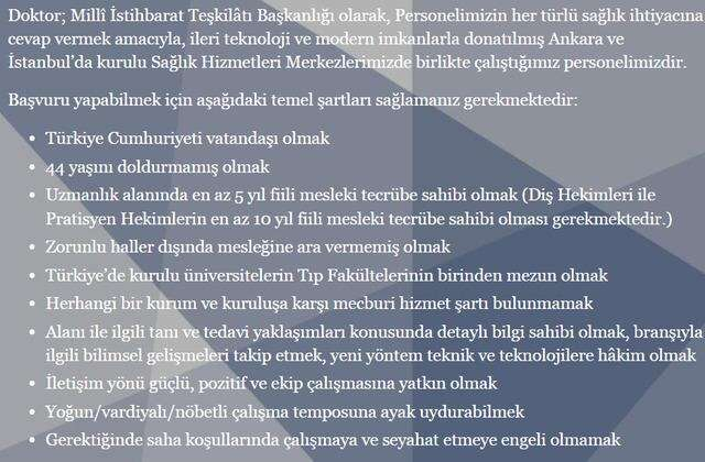 Milli İstihbarat Teşkilatı (MİT) bünyesinde görev yapmak üzere doktor ve sağlık personeli için internet sayfası üzerinden ilan yayınladı.