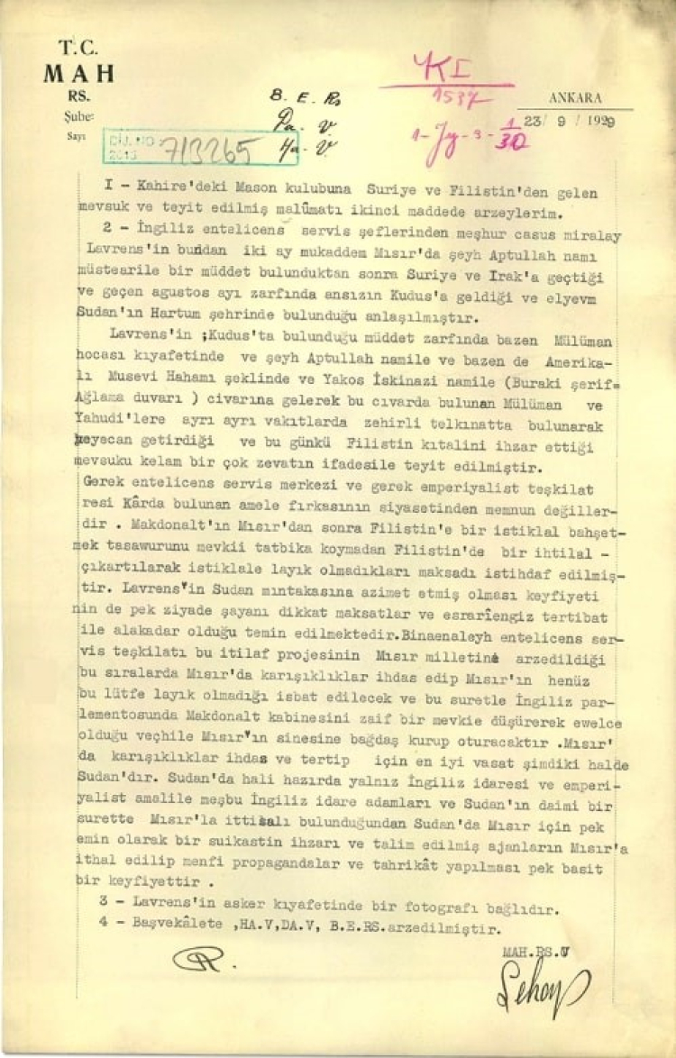 "Kahire'deki Mason kulübüne Suriye ve Filistin'den gelen mevsuk ve teyit edilmiş malumatı ikinci maddede arz eylerim. İngiliz entelicens servis şeflerinden meşhur casus Miralay Lavrens'in bundan iki ay mukaddem Mısır'da şeyh Aptullah namı müstearile bir müddet bulunduktan sonra Suriye ve Irak'a geçtiği ve geçen ağustos ayı zarfında ansızın Kudüs'e geldiği ve elyevm Sudan'ın Hartum şehrinde bulunduğu anlaşılmıştır. Lavrens'in, Kudüs'te bulunduğu müddet zarfında bazen Müslüman hocası kıyafetinde ve şeyh Aptullah namile ve bazen de Amerikalı Musevi hahamı şeklinde ve Yakos İskinazi namile (buraki şerif-ağlama duvarı) civarına gelerek bu civarda bulunan Müslüman ve Yahudilere ayrı ayrı vakıtlarda zehirli telkınatta bulunarak heyecan getirdiği ve bugünkü Filistin kıtalini ihzar ettiği mevsuku kelam birçok zevatın ifadesiyle teyit edilmiştir.