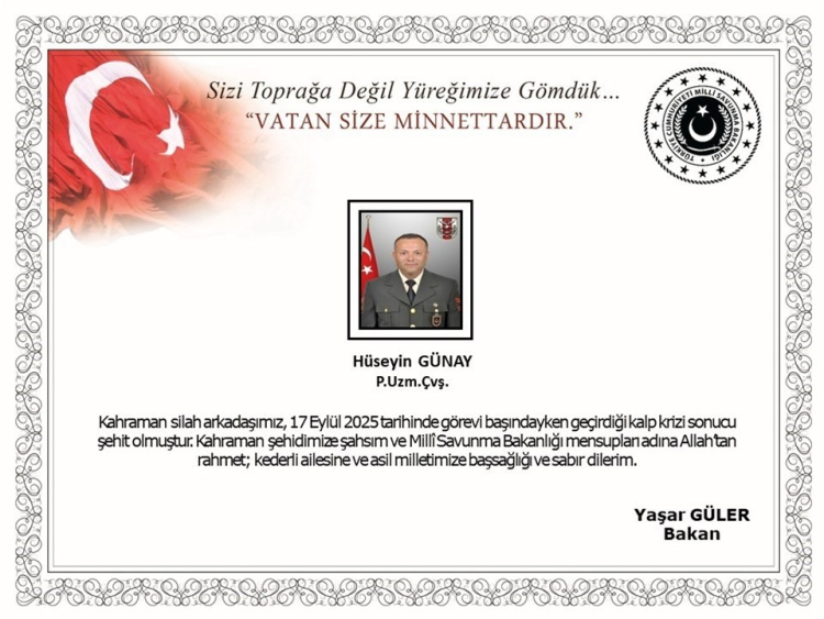 Bakanlıktan yapılan açıklamada "Kahraman silah arkadaşımız Piyade Uzman Çavuş HüseyinGünay, 17 Eylül 2025 tarihinde görevi başındayken geçirdiği kalp krizi sonucu şehit olmuştur." denildi.