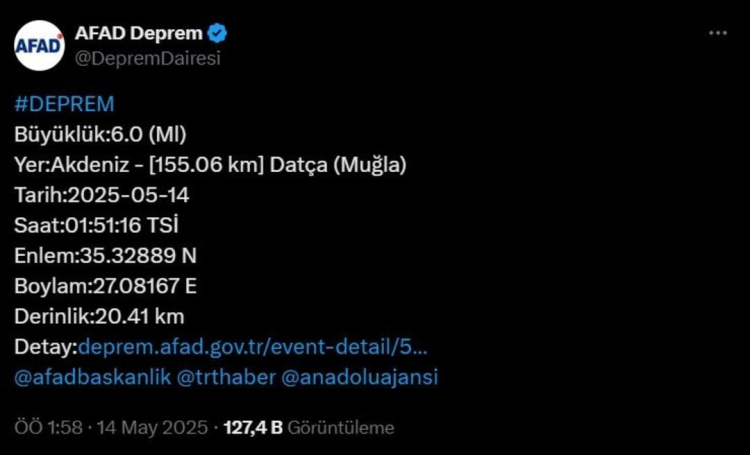 "Datça ilçesi, Akdeniz açıklarında 6 büyüklüğünde meydana gelen depremi hisseden tüm vatandaşlarımıza geçmiş olsun. Ekiplerimizin yaptığı araştırmada ilk belirlemelere göre depremin herhangi bir hasara neden olmadığı tespit edilmiştir. Saha çalışmalarımız devam ediyor. Allah ülkemizi ve milletimizi tüm afetlerden korusun."