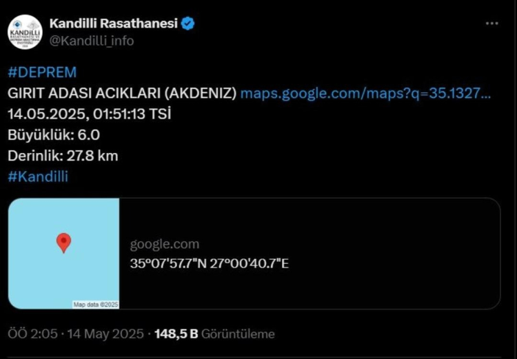 Kandilli Rasathanesi ise 6 büyüklüğündeki depremin merkezinin Akdeniz'in Girit Adası açıkları olduğunu duyurdu. Kandilli depremin denizin 27.8 kilometre derinliğinde gerçekleştiğini aktardı.