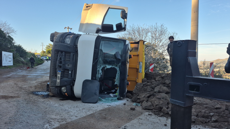 Muğla'nın Bodrum ilçesinde yol kenarındaki çukura giren hafriyat kamyonu devrilirken, yolun trafiğe kapandığı kazada 1 kişi yaralandı.
