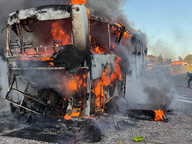 Olay, Muğla'nın Marmaris-Datça Karayolu Mezargediği mevkiinde saat 19.00 sıralarında meydana geldi. Edinilen bilgiye göre, seyir halindeki bir tur otobüsü, henüz bilinmeyen bir nedenle yanmaya başladı. Dumanları fark eden şoför aracı durdururken, yolcular ve sürücü hızla otobüsten indi. Kısa sürede alev topuna dönen otobüs çevrede kısa süreli paniğe neden oldu. İhbar üzerine bölgeye sevk edilen itfaiye ve orman ekipleri yangına müdahale etti. Ekiplerin hızlı müdahalesi sayesinde alevler çevredeki ormanlık alana sıçramadan kontrol altına alınarak söndürüldü. Yangında can kaybı ve yaralanma yaşanmazken, otobüs kullanılamaz hale geldi. Olayla ilgili inceleme başlatıldı.