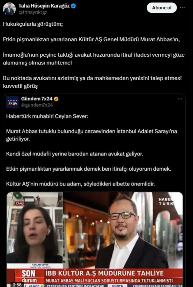 Abbas'ın tahliyesi bir anda gündem yaratırken ortaya çıkan 'etkin pişmanlık' detayı ise çok konuşuldu. Ekrem İmamoğlu'yla aynı operasyonda gözaltına alınıp tutuklanan İBB Kültür AŞ Genel Müdürü Abbas'ın savcılıkta etkin pişmanlık kapsamında ifade verdiği öğrenildi.