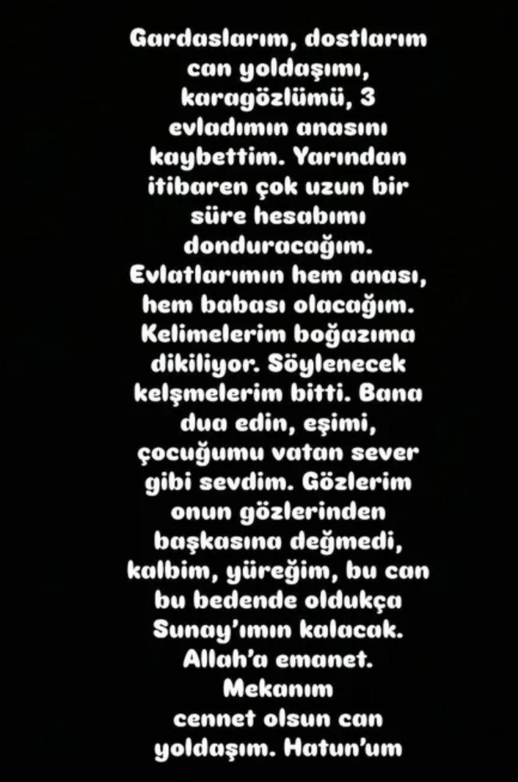 Söylenecek kelimelerim bitti. Bana dua edin, eşimi, çocuğumu vatan sever gibi sevdim. Gözlerim onun gözlerinden başkasına değmedi, kalbim, yüreğim, bu can bu bedende oldukça Sunay'ımın kalacak. Allah'a emanet. Mekanın cennet olsun can yoldaşım. Hatun'um" dedi.