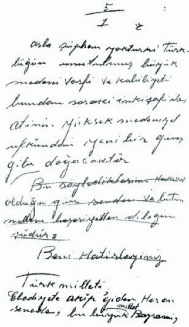 İstanbul Aydın Üniversitesi Öğretim Üyesi ve Emekli Tuğgeneral Dr. Naim Babüroğlu, Atatürk'ün yazısını düzeltirken çok duygulandığı anı şöyle anlattı: Son sayfada, son cümle: "Türk Milleti! Ebediyete akıp giden her on senede bu büyük millet bayramını, daha büyük şereflerle, saadetlerle, huzur ve refah içinde kutlamanı gönülden dilerim. Ne Mutlu Türküm diyene!" sözleriyle bitiyordu. Bu son cümleden önce, Atatürk'ün sesinden duymadığımız, ancak kâğıda yazdığı şu sözler duygu yüklü, hüzünlü bir veda gibiydi: "Bu söylediklerim hakikat olduğu gün, senden (Türk Milleti'nden) ve bütün medeni beşeriyetten (uygar insanlık âleminden) dileğim şudur: Beni hatırlayınız!" Bu cümleye geldiğinde duygulanır. O anda, yanında bulunan Hikmet Bayur'un da etkisiyle, bu mutlu günde milletine veda anlamı vereceğini düşünerek bu cümlenin üzerini çizerek törende okumaktan vazgeçer.