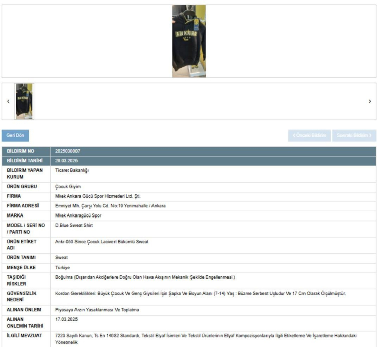 Vatandaşların yakından takip ettiği listeye 'Ankaragücü' yazılı Mkek Ankaragücü Spor markalı ürün listeye girdi. 'Mkek Ankara Gücü Spor Hizmetleri Ltd. Şti.' firmasına ait olan ürünün piyasadan toplatılmasına ve yasaklanmasına karar verildi.