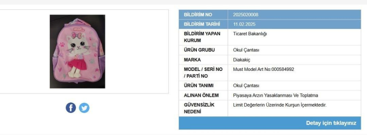 Ticaret Bakanlığı güvensiz ürün bildirimleri, Tarım ve Orman Bakanlığı ise Taklit ve Tağşiş Yapılan Ürünler listesiyle vatandaşları riskli ya da yanıltıcı ürünler konusunda uyarmaya devam ediyor. Bakanlıklar kamuoyuyla paylaştıkları listelerle hem markaları hem ürünleri hem de fotoğraflarını duyururken son olarak Ticaret Bakanlığı'nın listesine bir yeni ürün daha eklendi. Bir çocuk ürünü olan okul çantasıyla ilgili ebeveynleri yakından ilgilendiren karar alındı. Ürün yasaklandı ve toplatılıyor.