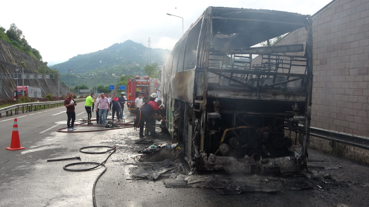 Ordu’dan İstanbul’a giden ve yolda arızalandıktan sonra tamiratı yapılan otobüs, sanayiden çıktıktan 15 dakika sonra tünel içerisinde alev aldı. 37 yolcu başka bir otobüse tahliye edildi.