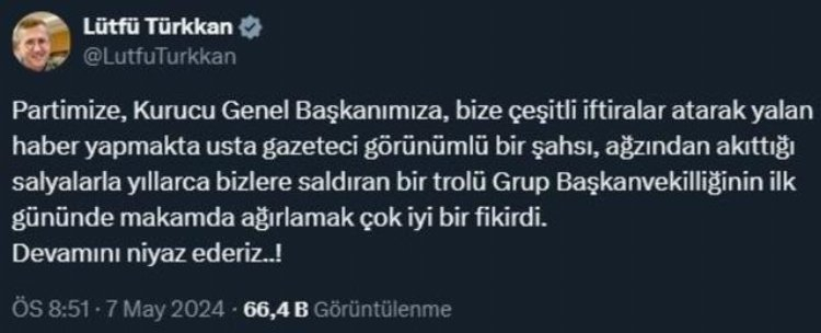 İYİ Parti cephesinden de benzer tepkiler yükseldi. İYİ Parti Kocaeli Milletvekili Lütfü Türkkan sosyal medya hesabından yaptığı paylaşımda "Partimize, Kurucu Genel Başkanımıza, bize çeşitli iftiralar atarak yalan haber yapmakta usta gazeteci görünümlü bir şahsı, ağzından akıttığı salyalarla yıllarca bizlere saldıran bir trolü Grup Başkanvekilliğinin ilk gününde makamda ağırlamak çok iyi bir fikirdi. Devamını niyaz ederiz..!" ifadelerini kullandı.