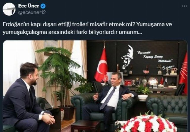 Gazeteci Ece Üner de "Erdoğan’ın kapı dışarı ettiği trolleri misafir etmek mi? Yumuşama ve yumuşakçalaşma arasındaki farkı biliyorlardır umarım…" ifadelerini kullandı.