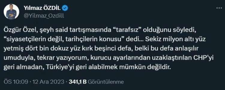 CHP Genel Başkanı Özgür Özel'in 'Şeyh Sait' ile ilgili canlı yayında yaptığı yorum gündem oldu. Gazeteci Yılmaz Özdil, Özel'in açıklamalarına tepki göstererek "Kurucu ayarlarından uzaklaştırılan CHP'yi geri almadan, Türkiye'yi geri alabilmek mümkün değildir" dedi. Aynı dakikalarda Muharrem İnce tarafından yapılan paylaşım da dikkat çekti.