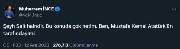 İnce sosyal medya hesabından yaptığı paylaşımda "Şeyh Sait haindir. Bu konuda çok netim. Ben, Mustafa Kemal Atatürk'ün tarafındayım!" dedi.