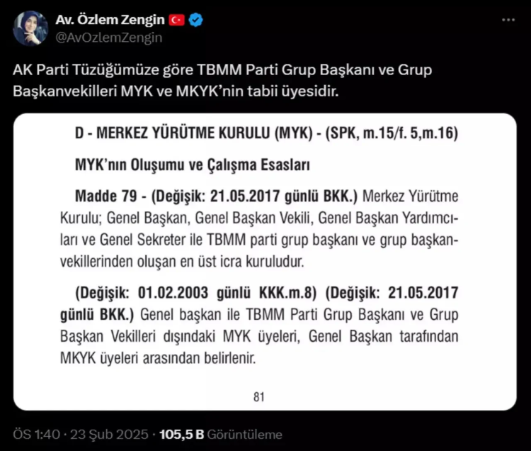 Bunun ardından AK Parti Grup Başkanvekili Özlem Zengin konuyla ilgili olarak açıklamada bulundu. Sosyal medya hesabından 'MYK oluşumu ve çalışma esasları'nı paylaşan Zengin, "AK Parti Tüzüğümüze göre TBMM Parti Grup Başkanı ve Grup Başkanvekilleri MYK ve MKYK’nin tabii üyesidir" dedi.
