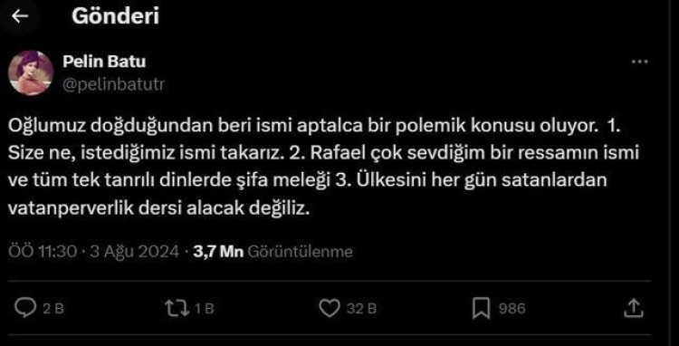 Pelin Batu 2019 yılında dünyaya gelen ve "Rafael" ismini verdiği oğluna neden bu ismi koyduğunu açıkladı. Batu, oğlunun adıyla ilgili yapılan yorumlardan sıkılınca isyan etti.