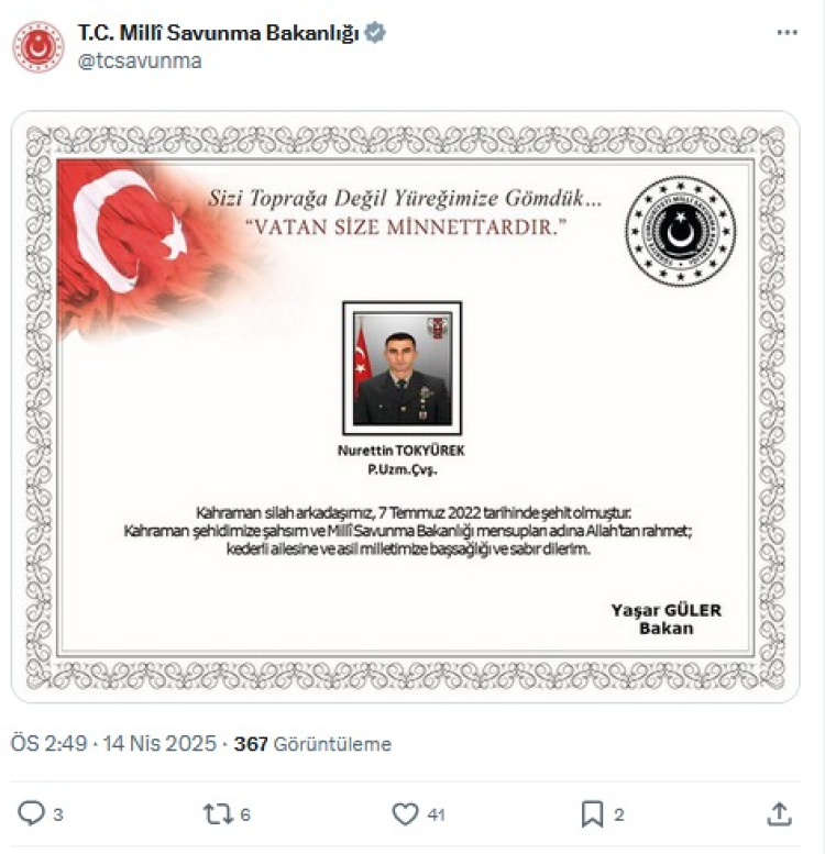 Milli Savunma Bakanlığı, 7 Temmuz 2022'de şehit olan Uzman Çavuş Nurettin'in Tokyürek'in naaşına 3 yıl sonra ulaşıldığını açıkladı.