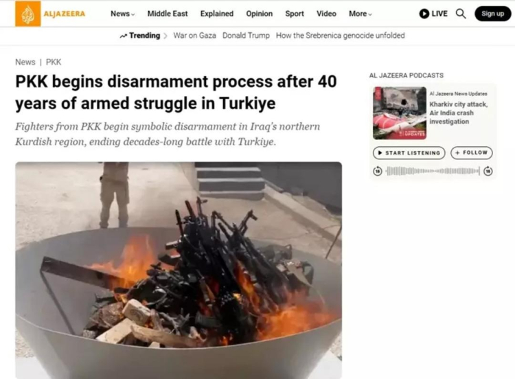 Katar merkezli Al Jazeera, “PKK’lılar, silahsızlanma sürecinin başlangıcını sembolik olarak silahlarını ateşe atarak ilan etti” dedi. Haberde, PKK üyelerinin topluma entegrasyon sürecine girmesinin hedeflendiği vurgulandı.