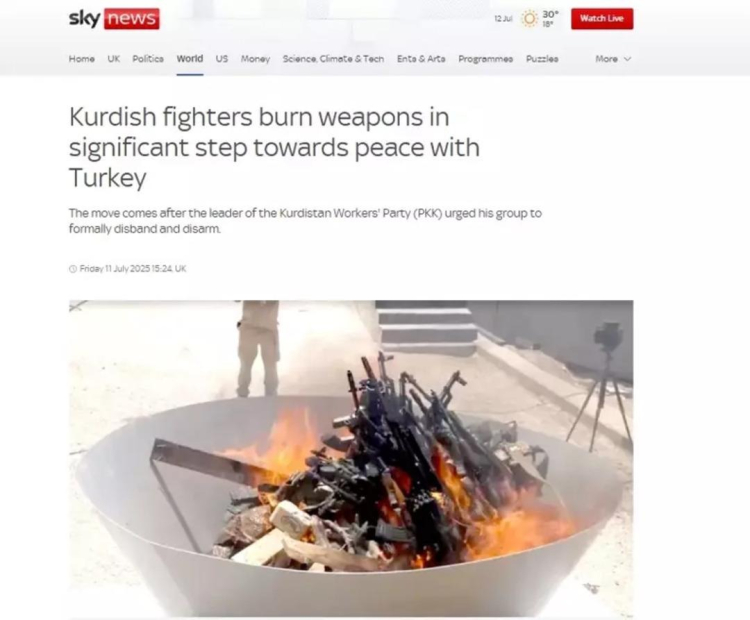 İngiltere merkezli Sky News, “Kuzey Irak’ta düzenlenen sembolik tören, Eylül’e kadar tamamlanması planlanan PKK’nın silah bırakma sürecinde kritik bir aşamayı temsil ediyor” ifadeleriyle haberi okuyucularına aktardı.