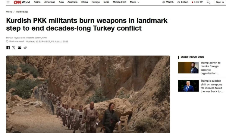 CNN, haberi “Kürt PKK militanları, Türkiye ile on yıllardır süren ihtilafı sona erdirmek için tarihi bir adım atarak silahlarını yaktı” başlığıyla verdi. Törenin 50 yılı aşkın süredir devam eden çatışmalarda dönüm noktası olduğu belirtildi.