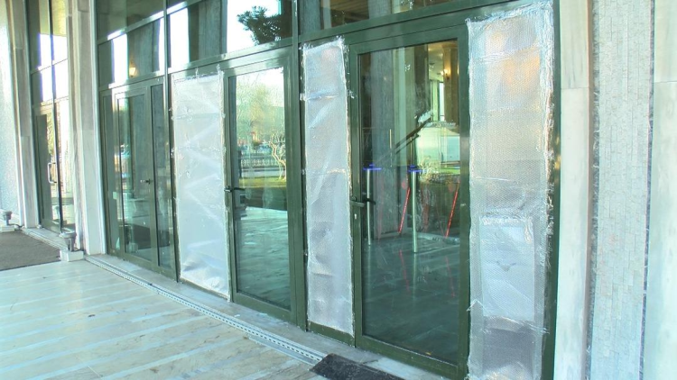 Binanın önündeki güvenlik bariyerlerini aşarak kapıyı zorlayan gruptakiler, açılmaması üzerine kapı ve camları kırarak içeri girdi.