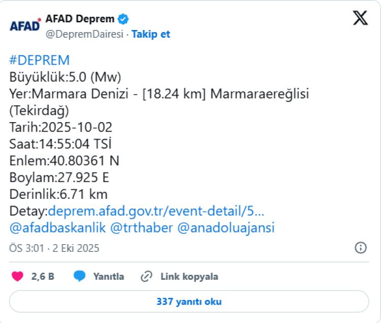 İstanbul'da saat 14:55'te tüm ilçelerinde hissedilen ve 15 saniye kadar süren bir deprem oldu. Afet ve Acil Durum Yönetim Başkanlığı (AFAD), depremin Marmara Denizi'nde Tekirdağ'ın Marmaraereğlisi ilçesi açıklarında meydana geldiğini duyurdu.