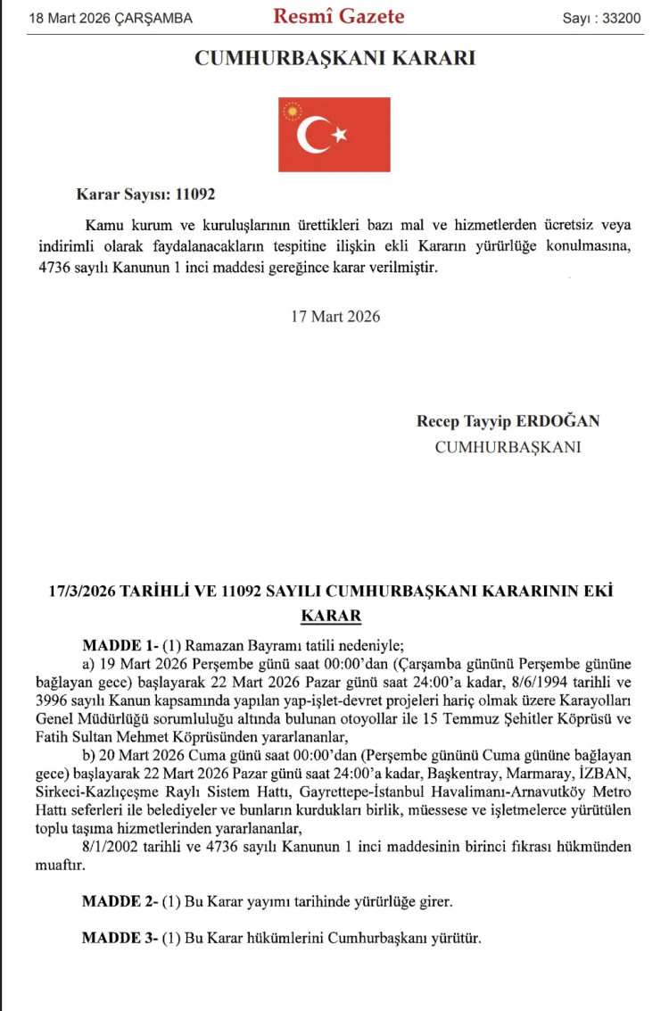 Resmi Gazete’de yayımlanan Cumhurbaşkanı Kararı’na göre, Ramazan Bayramı süresince belirli köprü ve otoyollar ile bazı toplu taşıma hizmetleri ücretsiz olacak.
