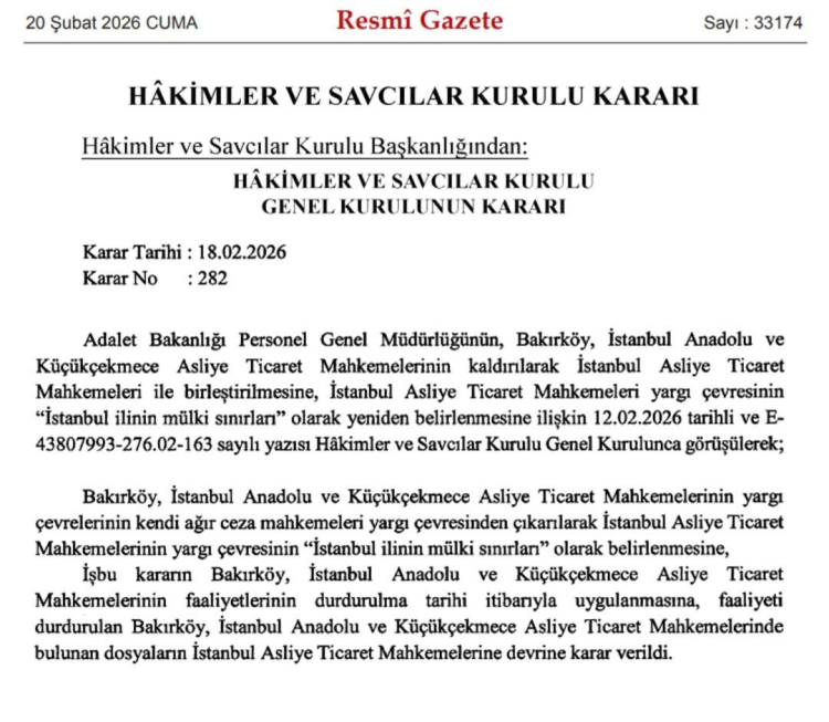 Resmi Gazete'de yayımlanan kararda, "Bakırköy, İstanbul Anadolu ve Küçükçekmece Asliye Ticaret Mahkemeleri yargı çevrelerinin kendi ağır ceza mahkemeleri yargı çevresinden çıkartılarak İstanbul Asliye Ticaret Mahkemelerinin yargı çevresinin 'İstanbul ilinin mülki sınırları' olarak belirlenmiştir" ifadesine yer verildi.