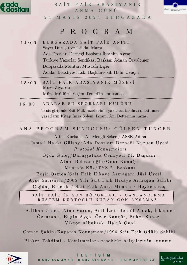 Adalar Belediye Başkanı Ali Ercan Akpolat’ın da katılacağı etkinlik Burgazada İskelesi’nde Ada Dostları Derneği Başkanı İbrahim Aycan’ın Türkiye Yazarlar Sendikası Başkanı Adnan Özyalçıner’in, Burgazada Muhtarı Mustafa Biçer’in ve Adalar Belediyesi Eski Başkan Vekili Hıdır Uvaçin’in konuşmalarıyla açılacak.