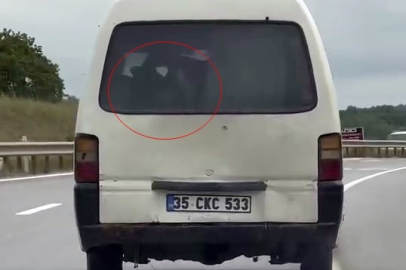 Sakarya'da bir sürücünün, panelvan tipi aracının arkasına yerleştirdiği buzağı ile yolculuğu cep telefonu kamerası ile kaydedildi.