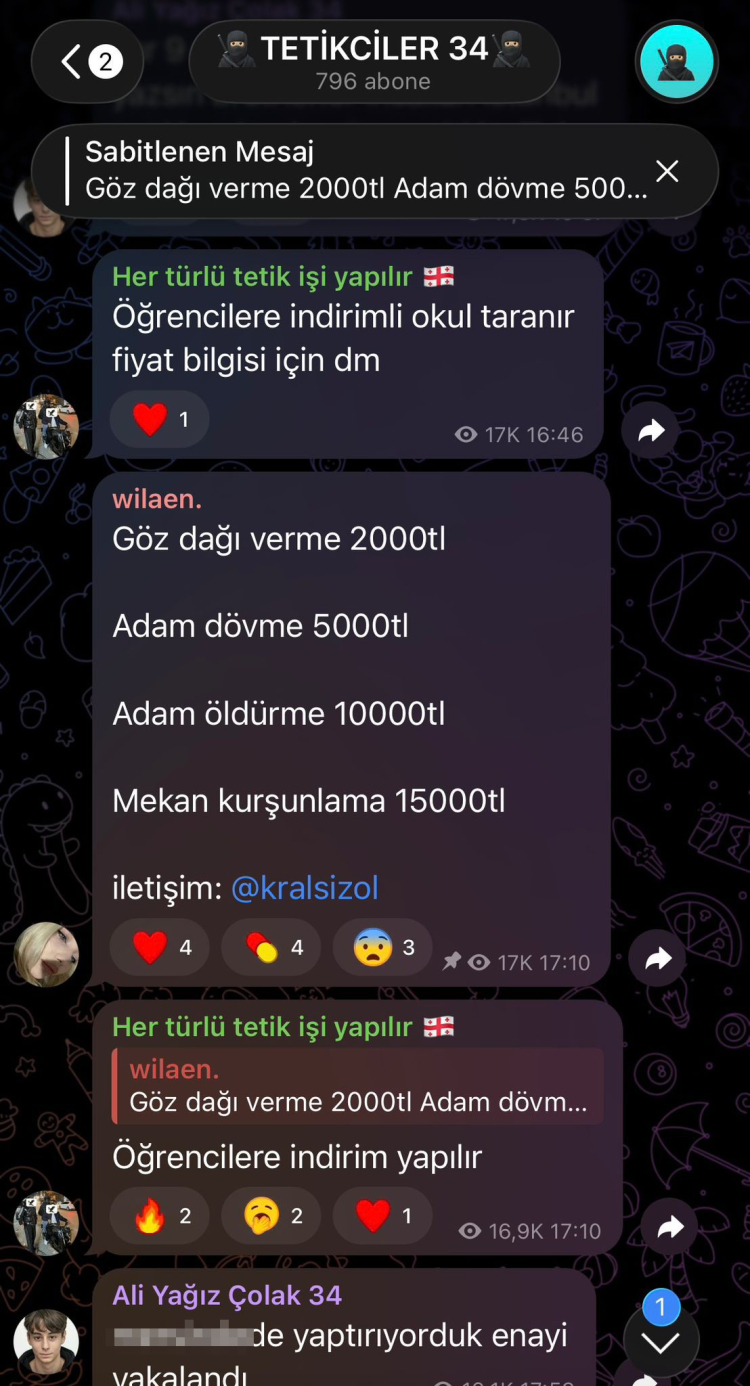 Grupta "Barış Çelik" ismiyle yazan kullanıcının, "Yarına bir sürü müşteri çıktı. Okullara saldırılan düzenleyeceğiz" mesajı dikkat çekerken, bir başka kullanıcı ise, "İşler açıldı. Her türlü okul basılır" ifadesi dikkat çekti. Grupta saldırılar için fiyat tarifesi paylaşıldığı da görüldü.