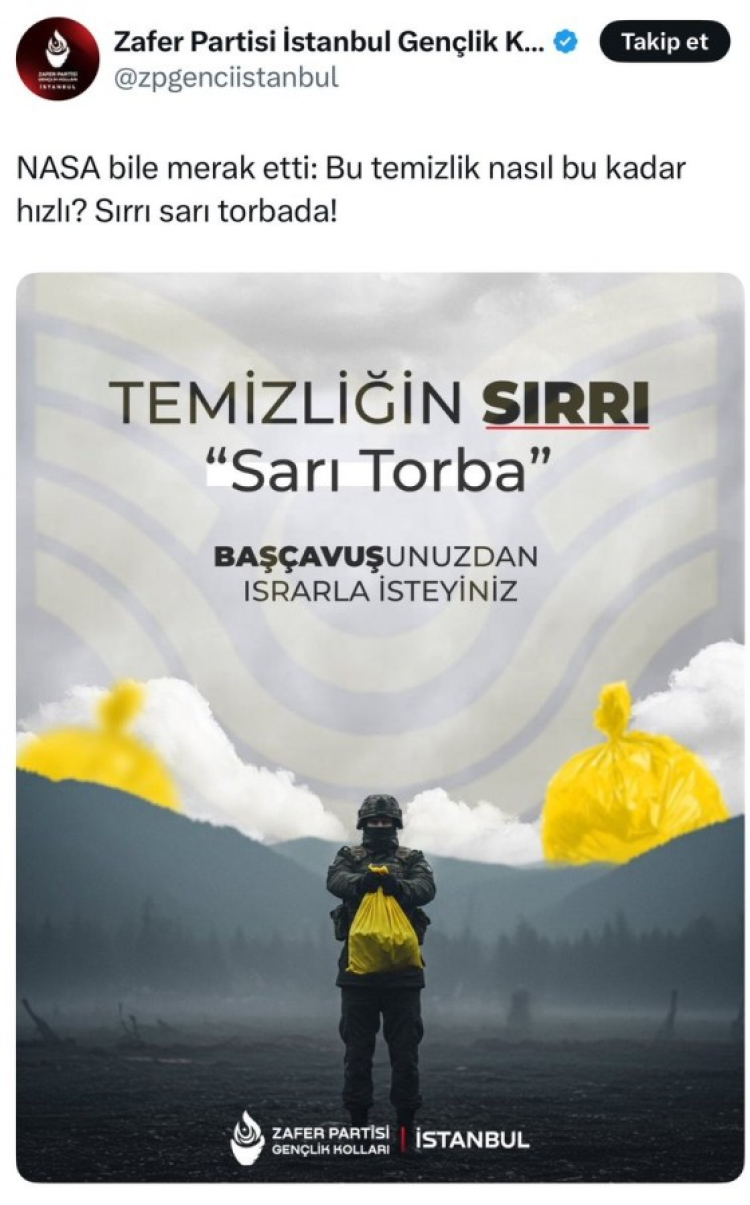 TBMM Başkanvekili Sırrı Süreyya Önder'in dün yaşamını yitirmesinin ardından Zafer Partisi İstanbul İl Gençlik Kolları'ndan bir paylaşım yapıldı. Paylaşımda "Temizliğin sırrı sarı torba" yazıldı.