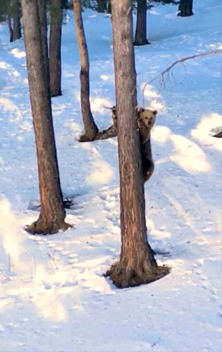 Görüntülerde, Kars'ın Sarıkamış ilçesinde sarıçam ağaçları arasında kış uykusundan uyanır uyanmaz devasa boz ayının ustalıkla ağacın gövdesine sarılarak hızla yukarı tırmandığı görüldü. Ayının hareketi vatandaşları gülümsetti.