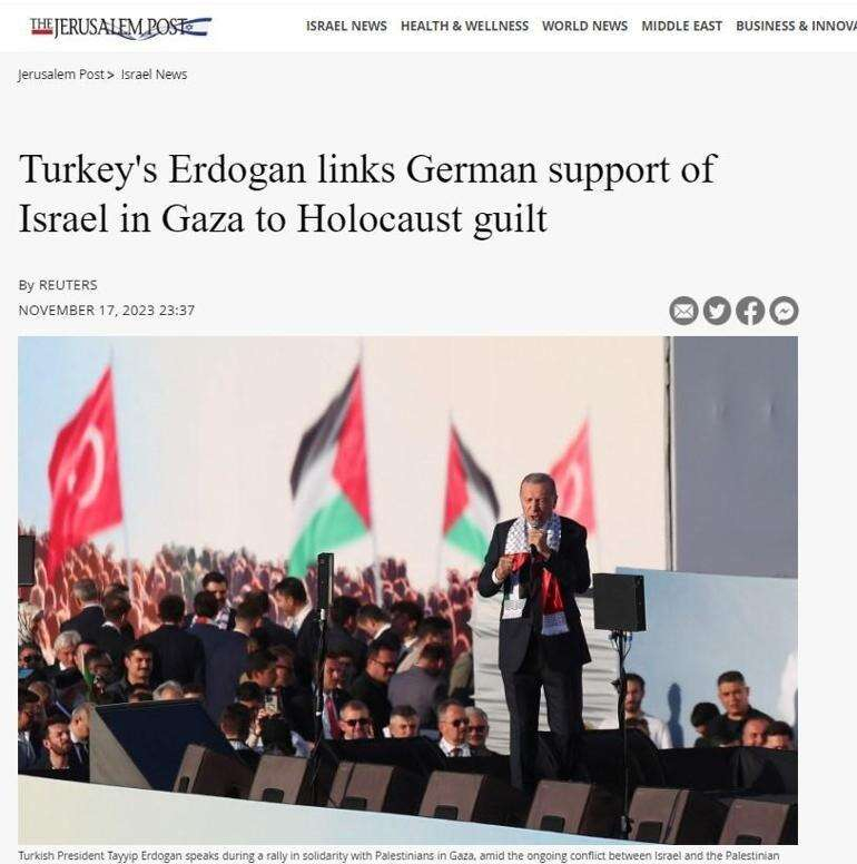 Online yayın yapan The Times Of Israel gazetesi, Erdoğan ise, Cumhurbaşkanının Almanya'ya İsrail konusunda yönelttiği eleştirileri yazan bir diğer kuruluş oldu. Gazete Almanya'nın İsrail'in 'sadık bir müttefiki' olduğunu da okuyucularına hatırlattı. İsrailli The Jerusalem Post gazetesi, "Erdoğan, Almanya'nın Gazze'de İsrail'e verdiği desteği Holokost ile bağdaştırdı" dedi.
