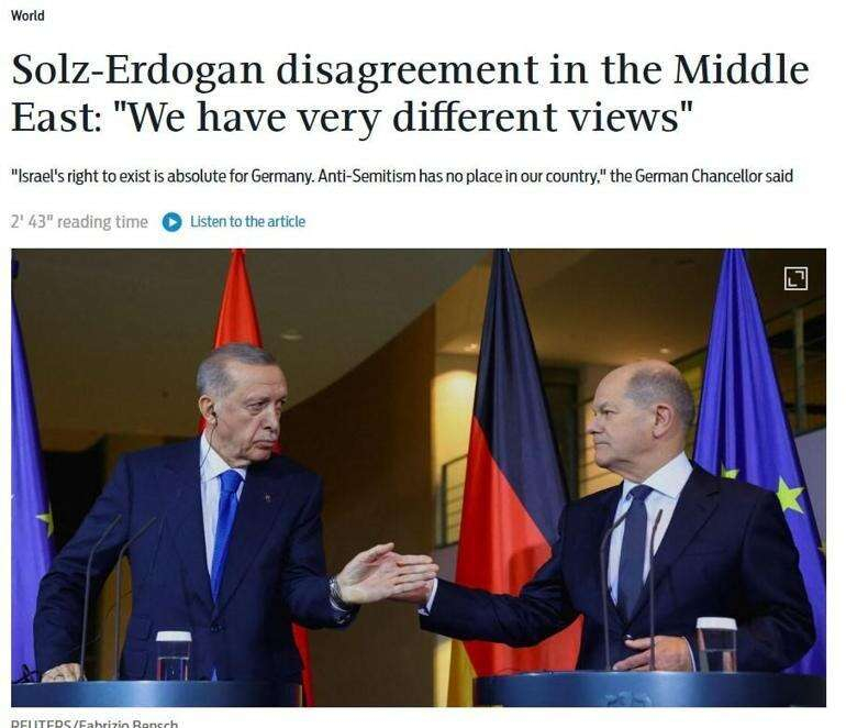 Kathimerini ise "Orta Doğu'da Erdoğan Scholz anlaşmazlığı" başlığı ile iki liderin sözlerine yer verdi. İki siyasetçi bölgede "insani ateşkes" sağlanması için işbirliği yapmak istediklerini vurgularken, Erdoğan Schozl'dan farklı olarak kesin bir ateşkes çağrısında bulundu.