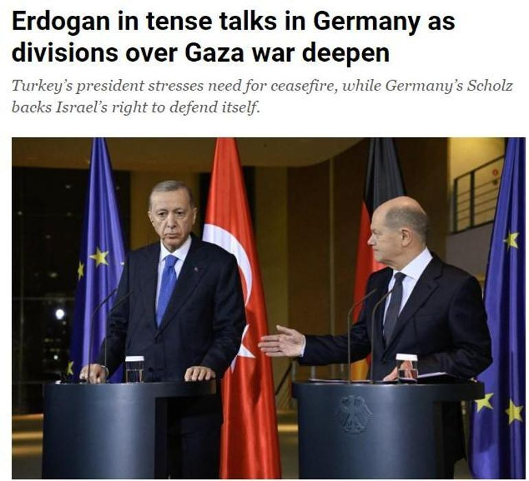 Orta Doğu'nun en büyük medya kuruluşlarından Al Jazeera (AJ) ise "Gazze savaşıyla ilgili görüş ayrılıkları derinleşti, Erdoğan ateşkes derken, Scholz İsrail'in kendini savunma hakkını destekliyor" ifadelerini kullandı.