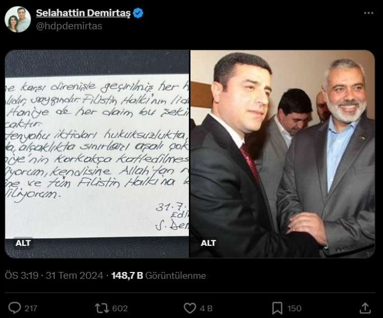 Edirne Cezaevi'nde tutuklu bulunan HDP'nin eski Eş Genel Başkanı Selahattin Demirtaş, Hamas lideri İsmail Haniye'nin, İsrail saldırısı sonucu öldürülmesine tepki gösterdi.