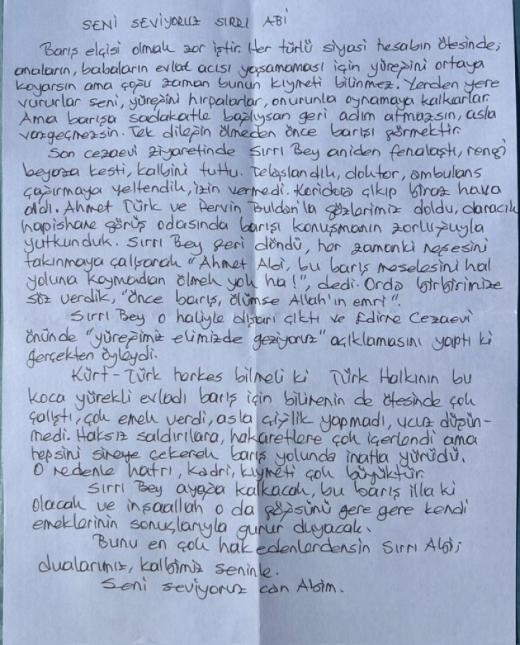 Haksız saldırılara, hakaretlere çok içerledi ama hepsini sineye çekerek barış yolunda inatla yürüdü. O nedenle hatırı, kıymeti, kıymeti çok büyüktür. Sırrı Bey ayağa kalkacak. Bu barış illa ki olacak ve inşallah o da göğsünü gere gere kendi emeklerinin sonuçlarıyla gurur duyacak. Bunu en çok hak edenlerdensin Sırrı Abi; dualarımız, kalbimiz seninle."