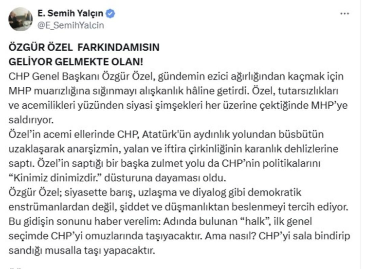 MHP Genel Başkan Yardımcısı ve İstanbul Milletvekili Semih Yalçın'dan CHP lideri Özgür Özel'e sert sözler geldi. Sosyal medya hesabından açıklama yapan Yalçın yazısının başında 'Geliyor gelmekte olan' ifadelerini kullanırken yazısının sonunda da CHP için 'musalla taş'lı göndermede bulundu.