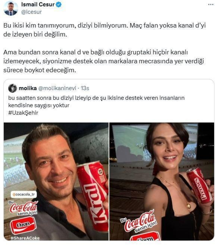 Uzak Şehir dizisinin başrol oyuncuları Sinem Ünsal ve Ozan Akbaba'nın aynı anda Coca-Cola reklamı paylaşmaları sosyal medyada tepki topladı. Cumhurbaşkanı Danışmanı İsmail Cesur da paylaşımı eleştirerek Kanal D ve bağlı kanalları boykot edeceğini açıkladı.