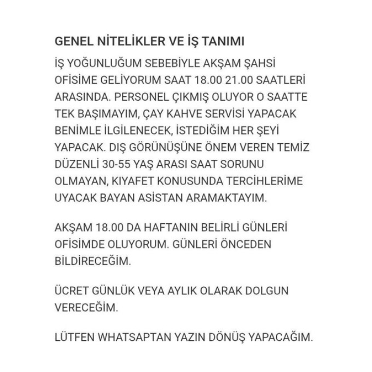 İlanda, kişinin "çay kahve servisi yapacak, kendisiyle ilgilenecek ve istediği her şeyi yapacak" bir kadın asistan aradığı belirtiliyor. Adayların 30-55 yaş arasında olması, dış görünüşüne özen göstermesi ve işverenin "kıyafet tercihine uyacak" nitelikte olması gerektiği vurgulanıyor.