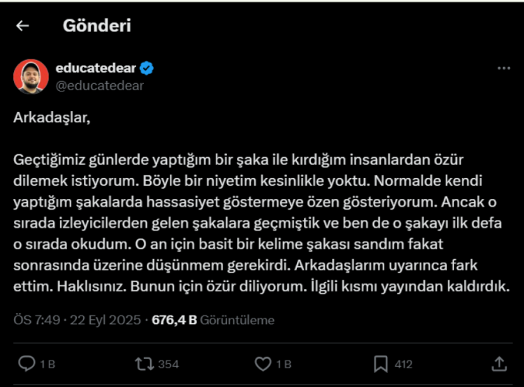 "Geçtiğimiz günlerde yaptığım bir şaka ile kırdığım insanlardan özür dilemek istiyorum. Böyle bir niyetim kesinlikle yoktu. Normalde kendi yaptığım şakalarda hassasiyet göstermeye özen gösteriyorum. Ancak o sırada izleyicilerden gelen şakalara geçmiştik ve ben de o şakayı ilk defa o sırada okudum. O an için basit bir kelime şakası sandım fakat sonrasında üzerine düşünmem gerekirdi. Arkadaşlarım uyarınca fark ettim. Haklısınız. Bunun için özür diliyorum. İlgili kısmı yayından kaldırdık."
