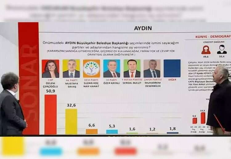 Aydın'da Çerçioğlu yüzde 50,9 gibi bir oranla önde. Burada DEM Parti 6,6 gibi bir oy oranına sahip. Aydın'da DEM ve İYİ Parti seçmeninin bir bölümü Çerçioğlu'na veriyor. Aydın'da Çerçioğlu radikal sol ile başkanlık yapmıyor. Oy verenlerin birçoğu milliyetçi.