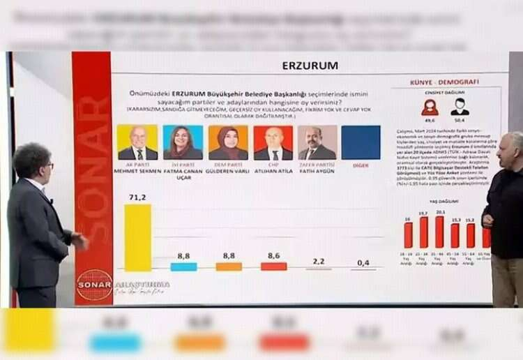 Erzurum'da biraz rekor var. Mevcut belediye başkanı yüzde 70 gibi bir rekor oranla tekrar seçilecek. İYİ Parti 2. olacak. 8,8 gibi bir oranla. CHP de Erzurum'da 8.6'lık bir oy olacak. Oyların geçen seçimine göre yükselişi ya da düşüşü, belediye başkanlarının şahsi başarılarını ifade ediyor. Seçmen yerel seçimleri, iktidarın ekonomi politikalarını cezalandırma olarak da kullanır. Böyle bir yansıma yok. Zafer Partisi birçok yerde 5. 6. sıralara oturmuş durumda.