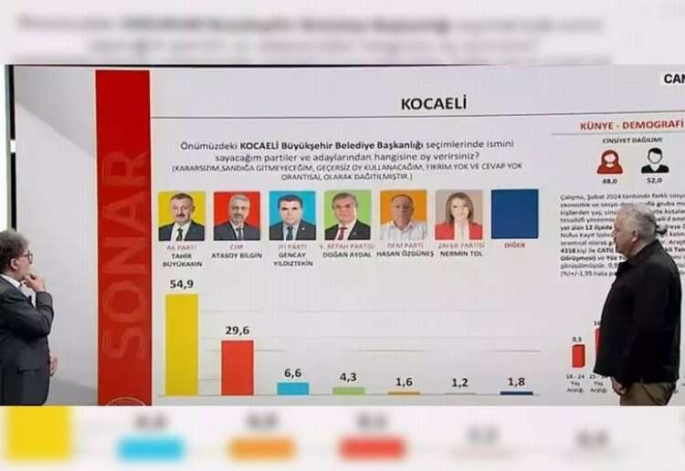 Kocaeli'de AK Parti adayı Tahir Büyük Akın 54,9, CHP Atasoy Bilgin ile 29,6 oranına sahip. Yine hatırlatmakta fayda var. Burada belediye başkanlarının kişisel başarısı büyük önem taşıyor. Tahir Bey siyaset kökenli de değil, akademisyen. Büyükşehir'de bir teveccüh var kendisine.